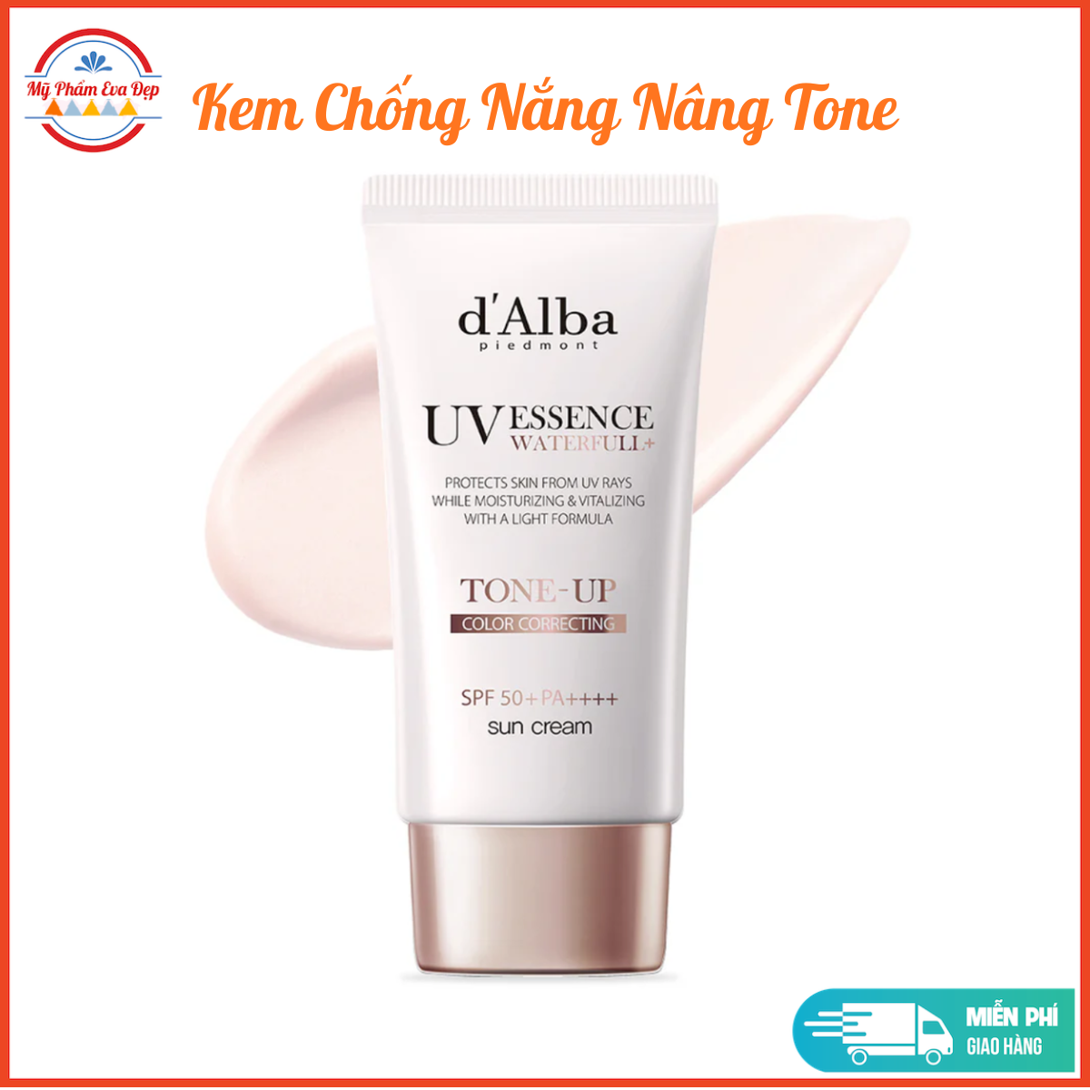 🌞 Kem chống nắng d’Alba UV Essence Waterfull+ Tone Up Color Correcting SPF50+ PA++++ là dòng chống nắng vật lý lai hóa học, vừa bảo vệ da khỏi tia UVA – UVB, vừa giúp nâng tông nhẹ nhàng, đều màu da tức thì. Chất kem mỏng nhẹ, thấm nhanh, tạo hiệu ứng da căng bóng tự nhiên, dùng làm lớp lót trang điểm rất đẹp, không bết dính, không nặng mặt.